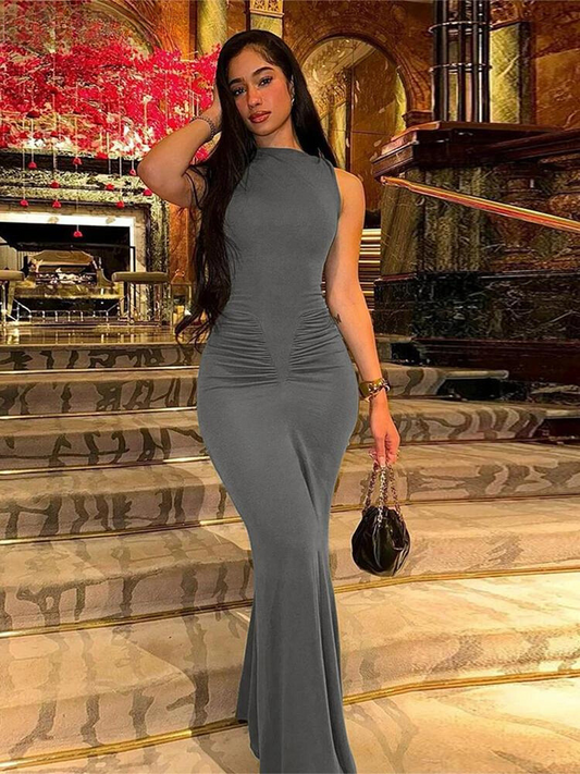 Simple Solid Sleeveless Cinched Waist Maxi Bodycon