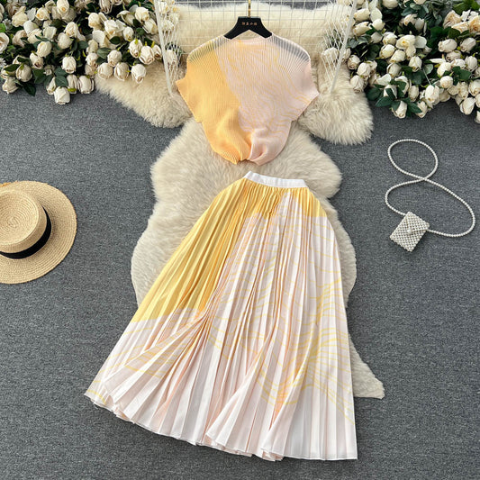Stretch Short-sleeved Top High Waist Pleated Skirt Two-piece Set