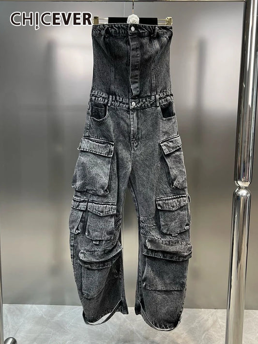 Streetwear Denim Jumpsuits for Women Strapless Sleeveless off Shoulder High Waist Cargo Pants